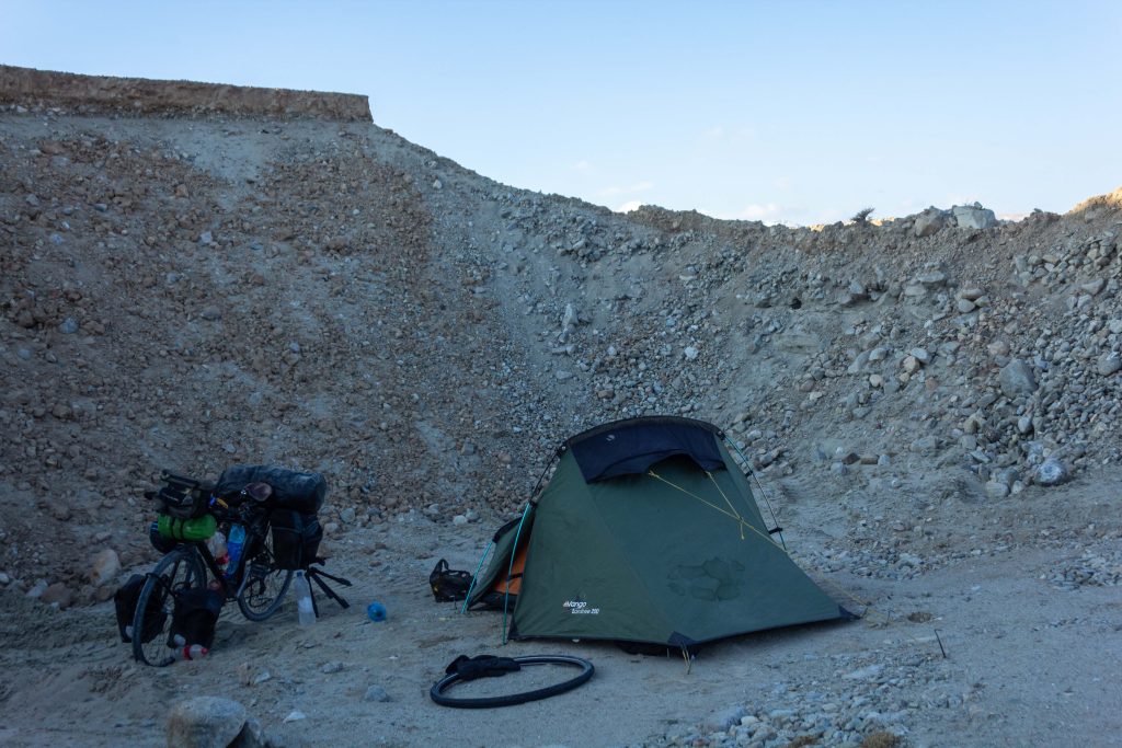 The actual pass to the plateau lay some twenty km’s ahead and we both wanted to get as close to the bottom as possible to ensure an easier ride the following day. We rode on and on until my legs could literally take no more at which point I stopped by what I thought was the perfect spot to camp. Annette came gliding down the last hill five minutes later and with the sun beginning its slow descent towards the horizon, we wheeled the bikes off the road and begin to pitch.