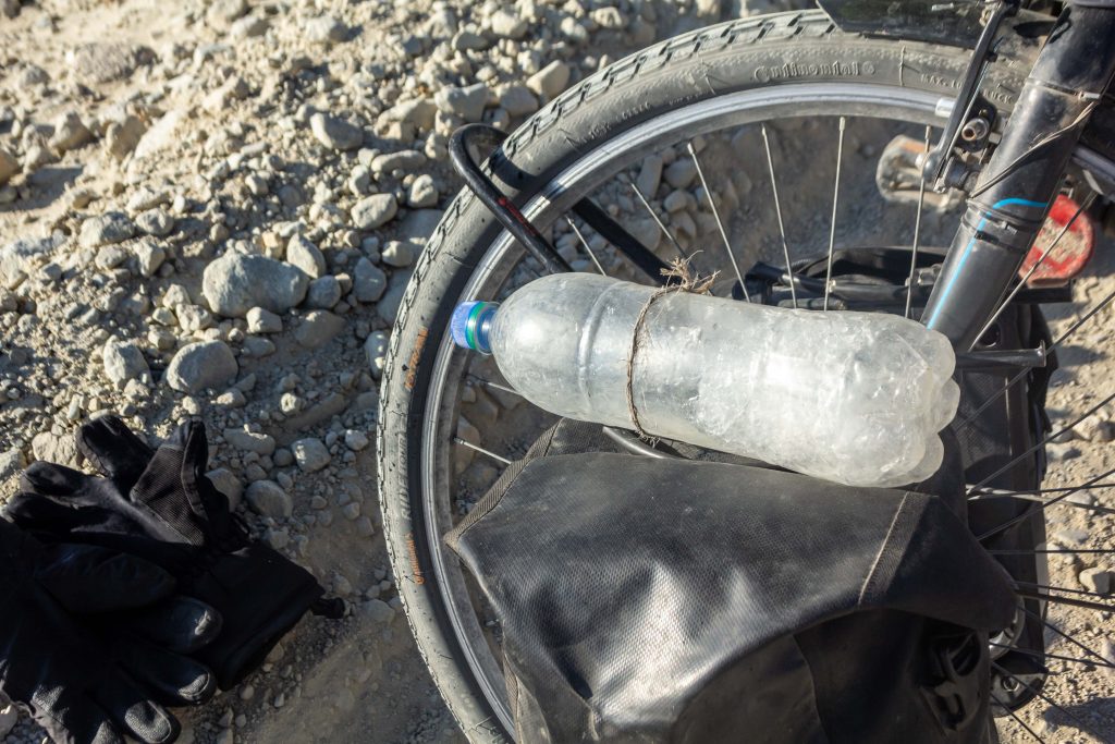 I decided to push my bike up the rest of the hill in the morning, if only to try to get some feeling back into my numb feet. I was strangely happy though in fact. I was over 4000 metre’s up, heaving my heavily laden bicycle through the gravel. My water was completely frozen and it was still – 10 degrees. It felt like a real adventure now. There ain’t no support crew here. I was on my own.