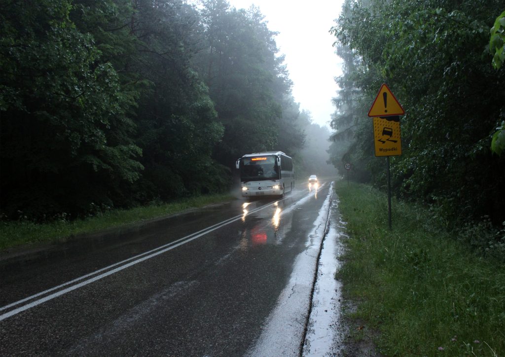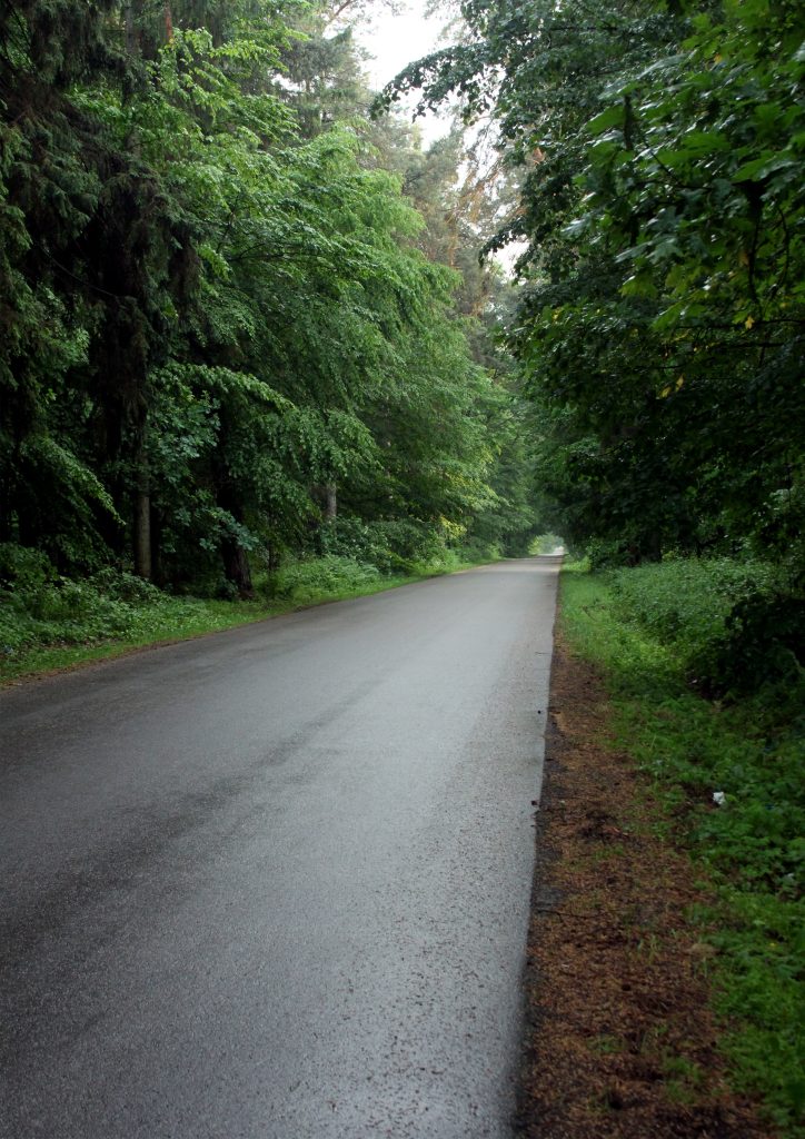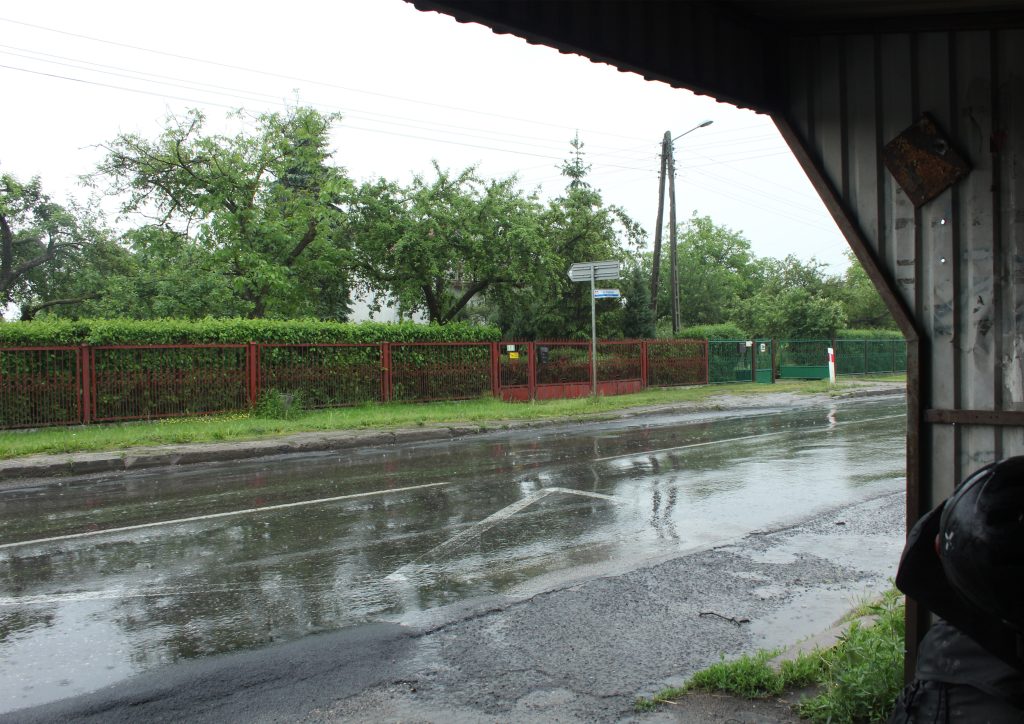 Well no sooner had I left the city of Starachowice and began to climb up into the national park area than the rain got underway yet again. I was eating some sandwiches and had just began to cycle along the forest road when a thunderstorm appeared overhead. There were no bus stops in sight now and so I had to just leave the bike resting against a tree whilst I dived into the woods to take some cover. I stood there for twenty minutes watching my bike and bags get a good seeing to. Big fat rain pummelled down relentlessly for fifteen straight minutes.