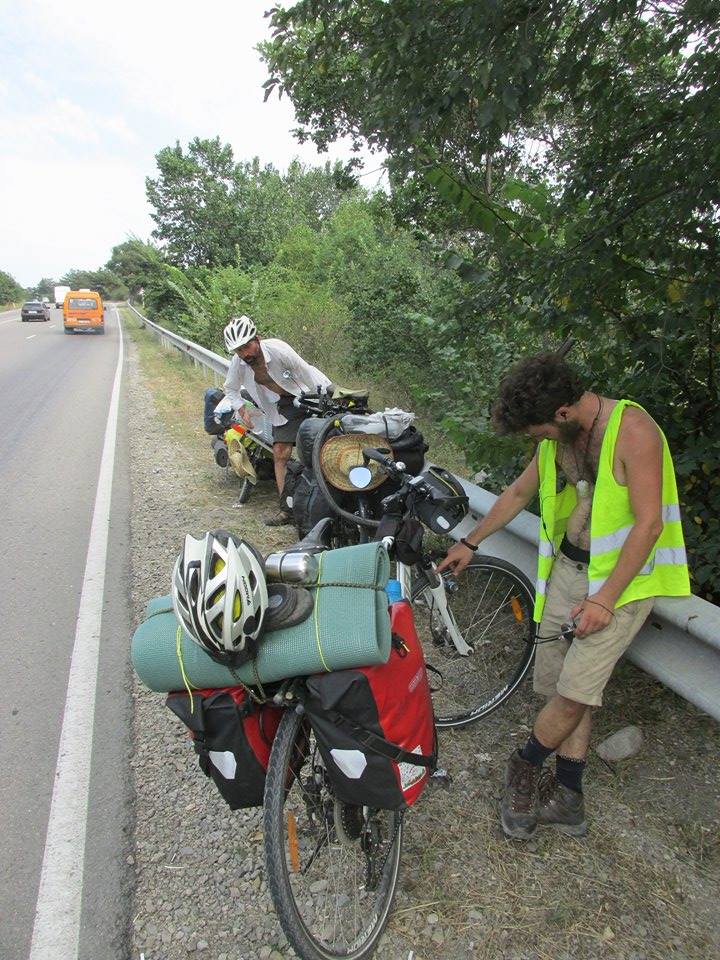 The funny thing was that after I had got my stove out in front of the shop and having boiled some water for coffee, I looked to my right and noticed there was a coffee machine right there. Think it cost one Lari which is about 30 cent’s. Still, every penny saved and all that. Making our way along the highway was pretty uneventful apart from the lada’s speeding past every few seconds. The driving definitely leaves something to be desired in this part of the country that’s for sure. On the plus side, the scenery on our left was wonderful as we followed the gentle slopes of the mighty Caucasus mountains. A man waved to us from the side of the road at one point wanting us to stop. I really wanted to carry on but Furkan, upon seeing the man holding a melon aloft thought otherwise. It was odd. We stopped, tried to tell him where we were going and where we had come from, ate some melon and then left. This happens quite regularly. As we were making our way north, I got my first puncture in quite a while which was also odd as I had two brand new tyres fitted thus this was the last thing I was expecting. It’s no fun changing an inner tube in this kind of heat too. Having put in a ‘new’ inner tube we began cycling again only to find another leak a little further on. We found some shade where I opted to patch over the hole rather than putting in a brand new tube. I wanted to save these for when I really needed them in the coming months. With the hole fixed, we were again on our way but we were making really slow progress towards the border. I was feeling very lethargic after two weeks off the bike and so I was really glad we were in no hurry like I had been in the previous couple of months. I was now in a position to take it easy, break often and camp when I felt tired or a great spot reared its head. It was a blessing.