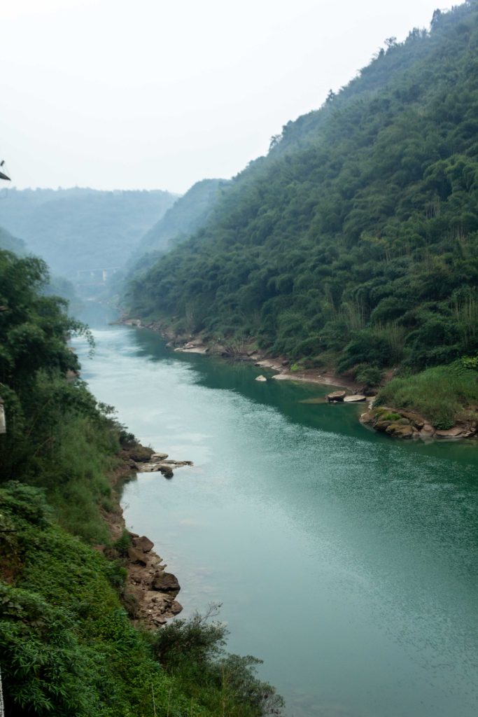 The road wound its way through a gorge before eventually following a beautiful blue river that just goes to show that not everything is polluted in China, yet. Bamboo grew everywhere too and was often to be found wilting over the road from both sides enveloping it quite snugly.